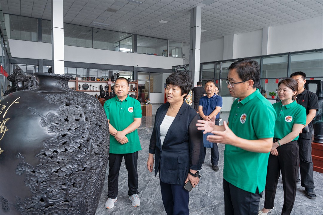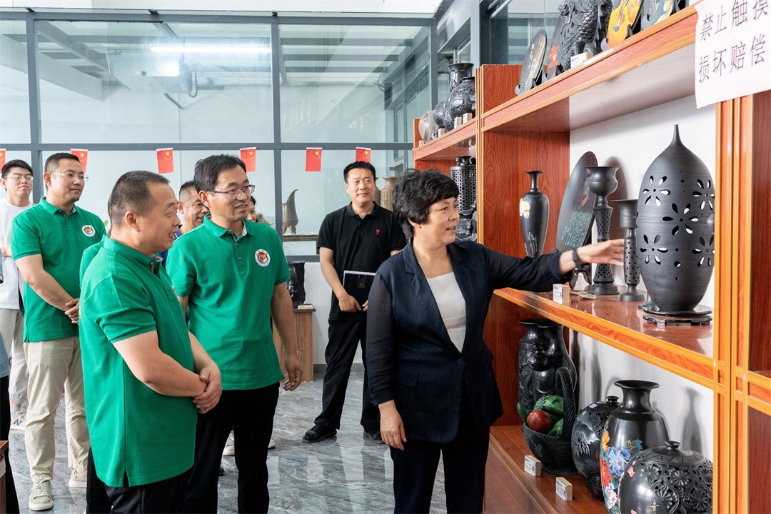 秦書(shū)記在視察龍格黑陶的過(guò)程中,對(duì)龍格黑陶的作品贊賞不已,感嘆黑陶工藝之高超,從10厘米高的筆筒到2.4米高的作品,從最容易的雕刻到最難的掐絲,從單色到多彩……浸潤(rùn)著技藝傳承人的執(zhí)著追求。黑陶文化是黃河流域文化,以其深厚的歷史底蘊(yùn)和豐富的人文內(nèi)涵,構(gòu)成漢文化的淵源龍脈。黑陶是非物質(zhì)文化遺產(chǎn),是濟(jì)陽(yáng)靚麗的文化名片,龍格黑陶得以將這一偉大、豐厚、輝煌的非物質(zhì)文化遺產(chǎn)延續(xù)傳承,讓其散發(fā)出更閃耀、更璀璨的光芒。她希望“龍格黑陶要將文化藝術(shù)與市場(chǎng)需求相結(jié)合,既能傳承發(fā)揚(yáng),也要有市場(chǎng)認(rèn)可。”