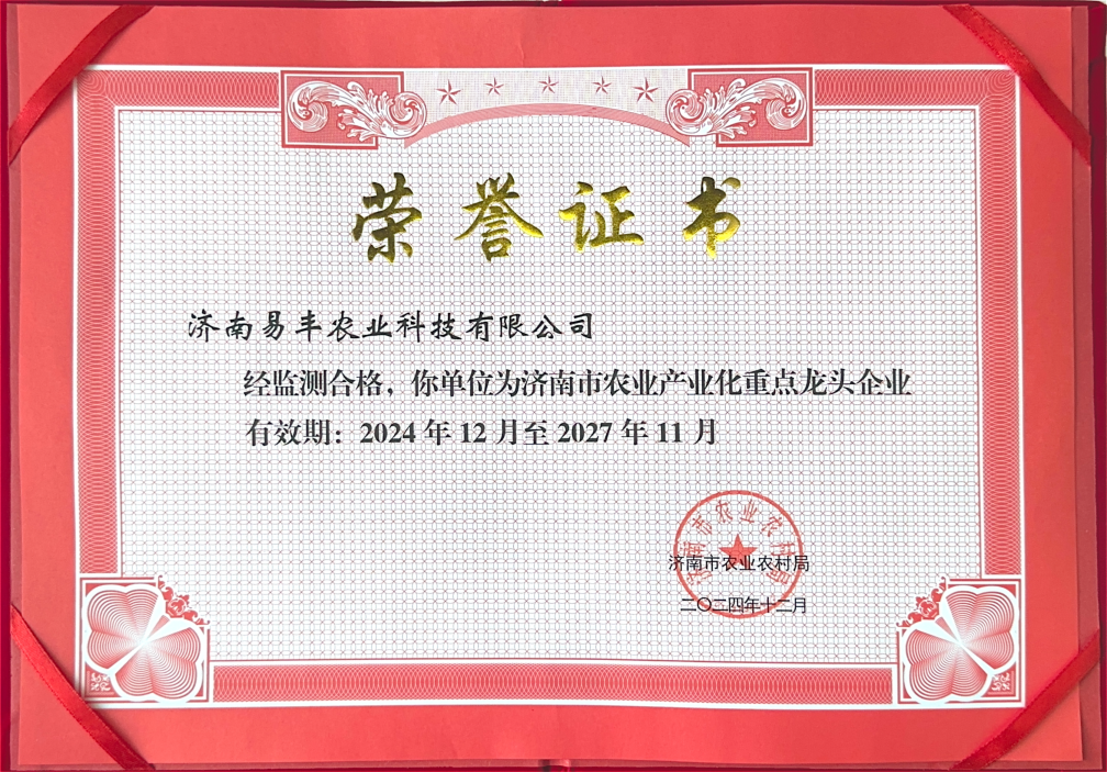 易豐農(nóng)業(yè)被授予濟(jì)南市第十八批農(nóng)業(yè)產(chǎn)業(yè)化重點龍頭企業(yè)、濟(jì)南市十佳巾幗現(xiàn)代農(nóng)業(yè)科技基地;成功入選濟(jì)南市“萬企興萬村”行動實驗項目名單;2024年,被認(rèn)定為科技型中小企業(yè),并獲得市級專家服務(wù)基地、市級農(nóng)民田間學(xué)校認(rèn)證。